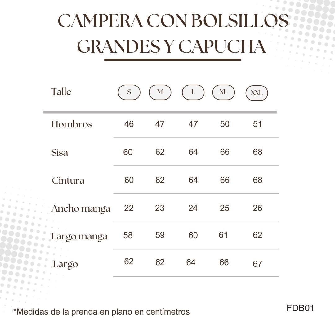 Si se basa en sus medidas corporales, tenga en cuenta que es un abrigo que suele llevar ropa abultada por debajo, por lo que tendrá que elegir el talle unos centímetros más grande para evitar que le quede chico o ajustado.